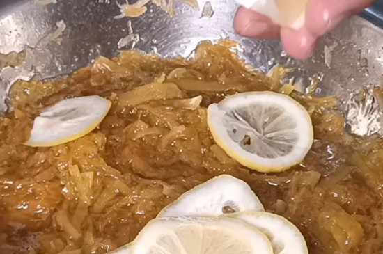 之后把水换掉,将柚子皮、柚子肉、冰糖放入锅中开大火煮沸,接下来转小火慢煮30分钟,等茶汤煮至粘稠后,倒在容器中,添加已经榨好的柠檬汁拌匀,最后放入冰箱中冷藏。