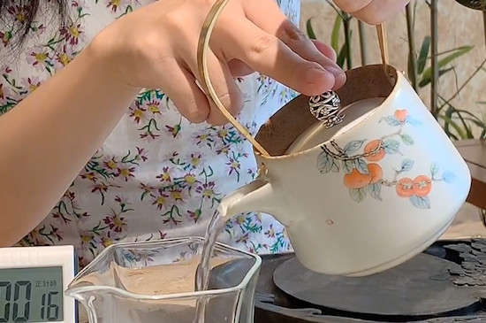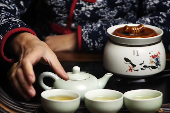 之后往瓷壶中注入山泉水,并把茶炉点燃,将瓷壶放在茶炉上把茶汤烧开,然后关火焖泡5分钟。等莓茶煮好后,将瓷杯码放好,提起瓷壶,缓缓将茶汤注入瓷杯中品饮。