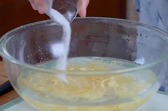 接下来将柚子皮用刀切成细丝,放入盐热水中浸泡10小时,逼出柚子皮中的苦味。在此期间需将柚子肉给掰碎,并去掉上面的白丝,放入容器中备用。2小时后将柚子皮从容器中取出,并用清水洗净,随后把柚子皮投入清水锅中烧沸腾。