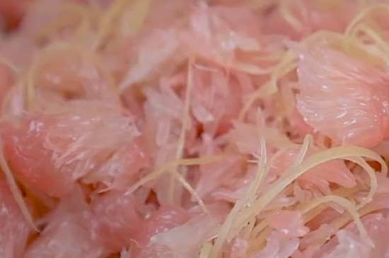 先将柚子表面的皮剥开分成几瓣,再将白色的瓤去除干净,只留下金黄色的部分,并用食盐搓洗干净,用刀将柚子皮切成细丝,放入盐热水中浸泡2小时。柚子肉需掰碎,去掉上面的白丝,之后将柚子皮洗净、和柚子肉、白糖放入热锅中熬煮。