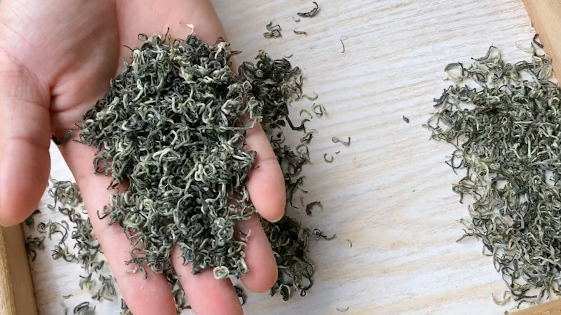 碧螺春是采摘鲜嫩芽头,经过杀青、揉捻、搓团显毫、炒青、炒制等工艺制成的,具有条索紧结、卷曲如螺、白毫毕露、银绿隐翠、叶芽幼嫩的特点,冲泡后汤色碧绿清澈,叶底柔匀,茶叶徐徐舒展,上下翻飞,清香袭人,口味凉甜,鲜爽生津。