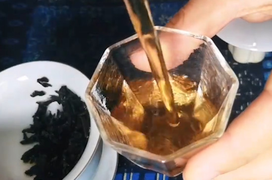 广西六堡茶成茶前叶片呈长椭圆披针形,叶色褐黑光润,间有黄花点,叶底红褐,成茶后条索长整紧结,带有松烟香或槟榔香,冲泡后汤色红浓、叶底铜褐、香气陈厚、滋味甘醇可口。