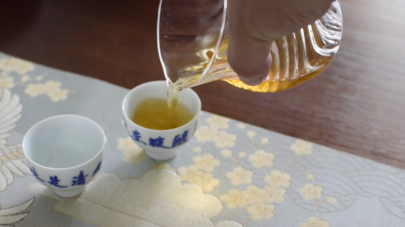 往茶杯中注入热水,浸泡几秒后,再依次倒入茶海、品茗杯等其他茶具之中,以提高茶具温度,以及清洁茶具。然后开始投茶,一般投茶3-5克,注入200ml热水,水温以90度左右为宜。