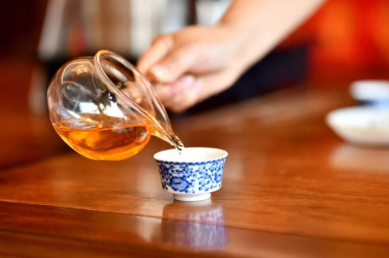 往盖碗中倒入沸水,浸泡10秒后出汤,将泡好的茶汤倒入公道杯中,再由公道杯分入品茗杯中。俗话说茶七酒八,倒茶时茶汤至茶杯七分满即可。