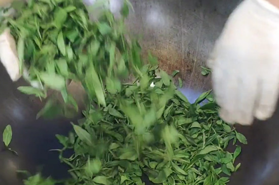 龙井茶制作的最后一步为炒制,整个炒茶过程分为青锅、回潮、辉锅三个阶段,先将茶叶放入锅中,炒制10分钟,使茶形扁平,然后将完成青锅后的茶叶起锅,摊平在竹筛中回潮,最后将回潮的龙井茶再次放入锅中翻炒,使水分含量低于5%,并进一步定型。