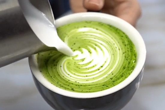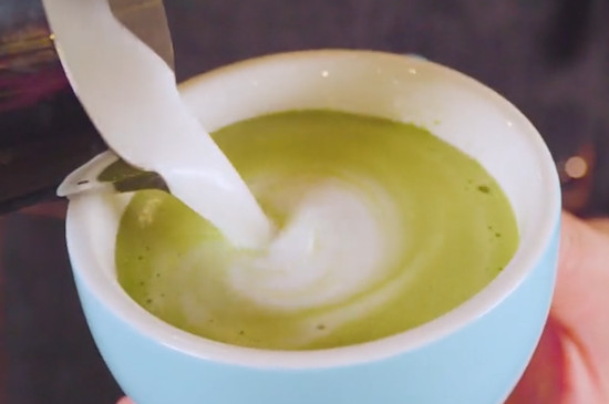 抹茶拿铁在制作时,若是自己有手艺或有条件,可以在抹茶拿铁的表面拉花,即将刚打发好的奶泡有节奏的倒在抹茶拿铁表面,绘制出自己想要的造型图案。由于拉花对技术要求较高的原因,所以对于想要拉花的初学者来讲需得多加练习。