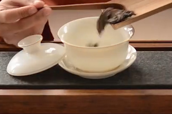 随后取出紫砂壶和紫砂杯,用茶匙把8~10g普洱茶化石投入紫砂壶中,注入沸水冲泡,并用茶匙快速搅拌茶汤,10秒后倒掉茶汤,继续注入沸水洗茶,如此往复3次。