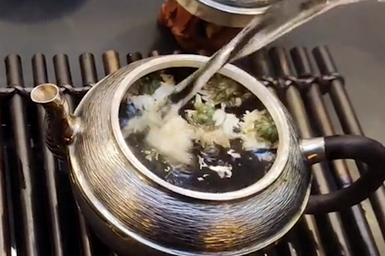 接着取出盖碗,用茶匙把5~7g小甘菊普洱茶投入盖碗中,注入沸水冲泡,并用茶匙快速搅拌茶汤,5~7秒后倒掉茶汤,继续注入沸水洗茶,去掉小甘菊普洱茶中的杂质。