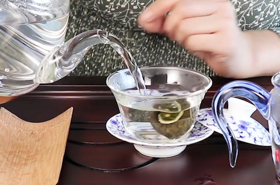 小青柑在冲泡时,先将盖碗放入茶洗中,揭开碗盖,注入沸水,再盖上碗盖,用沸水烫洗盖碗。或把盖碗放入玻璃茶洗中,注入清水,并将其置于电茶炉上将水烧开,对盖碗高温消毒。