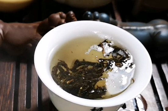 昔归古树茶在冲泡之前,先将紫砂壶放入茶洗中,揭开壶盖,注入刚烧开的沸水,再盖上壶盖,用沸水浇淋壶身。随后用茶夹依次夹取茶杯,停在茶洗上方,用沸水烫洗茶杯。
