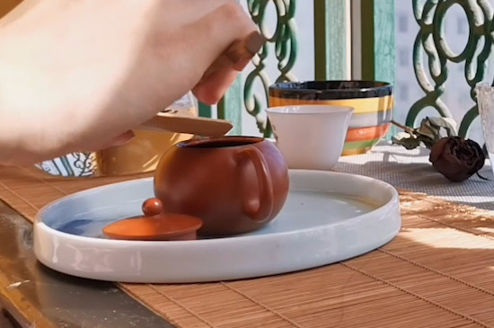继续往紫砂壶中注入沸水,并盖上壶盖焖泡,5分钟后把紫砂杯码放好,提起紫砂壶,将乌龙茶的茶汤缓缓注入紫砂杯中,最后端起紫砂杯,品饮乌龙茶的韵味即可。