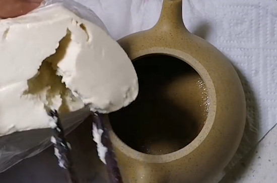 将紫砂杯煮好后就关火,捞出紫砂壶,将老豆腐填入紫砂壶中,并换水继续将紫砂壶煮20分钟,利用豆腐中所含有的石膏成分给紫砂壶去火。