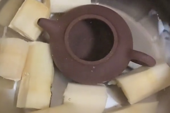 等锅里的水煮开后再次关火放凉,之后取出豆腐,填上新鲜切开的甘蔗,再一次换掉锅里的水将紫砂壶煮20分钟,最后去掉甘蔗,换上紫砂杯日后要泡的茶煮1小时,并将其洗净。