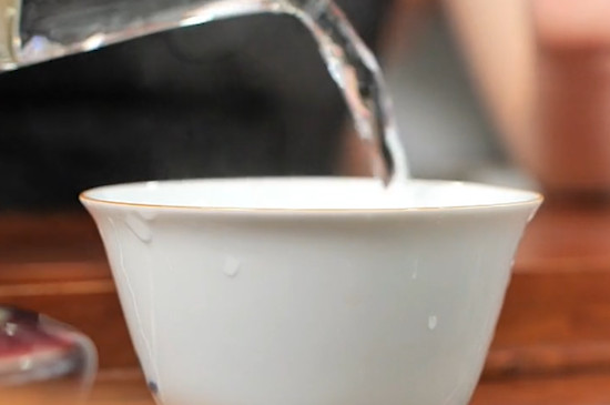 随后将刚烧开的沸水逐个倒入茶杯中,并用右手握住杯底基部,左手托住杯底,让手腕带着茶杯逆时针转动3圈,让整个茶杯的内壁都被沸水浸润,然后把沸水倒入水盂里。