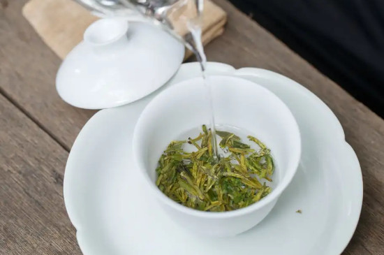 把茶杯放回杯托里之后,按照1:50的茶水比例,把茶荷中的干茶分别投入各个茶杯中,用回转手法往茶杯里倒入少许开水没过茶叶,让茶叶充分浸润,时间一般在20~50秒。