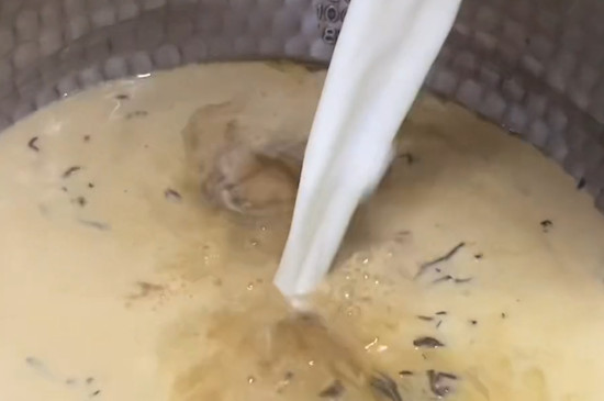 等纯牛奶开始冒泡后,倒入之前煮好的红茶,以及适量的咖啡糖继续煮,依旧一边煮一边用小木铲搅拌,直到咖啡糖完全融化,奶茶变色为止,最后倒出奶茶饮用即可。