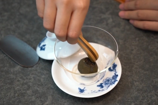 取出一颗完整的小青柑,撕掉外层包装纸,然后用茶夹将小青柑夹住,缓缓放入盖碗中,使其顶部盖朝上,接着将顶盖掀开,倒入少量的沸水进行洗茶,以去除小青柑表皮的灰尘和杂质,保持茶汤的纯净。