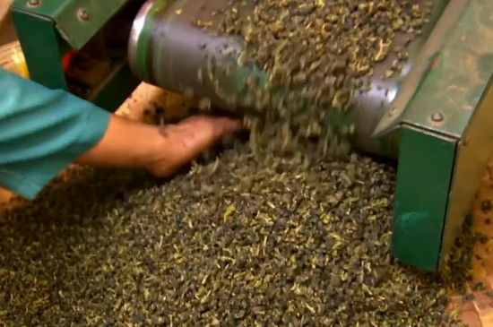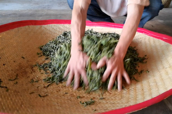 摇青之后,开始对人参乌龙茶揉捻,揉捻是鲜叶的造型步骤,即将茶叶放在平整的工具中不断用手揉搓,以使水分尽可能流出,然后将其制成球形或条索形,固定茶叶形状。