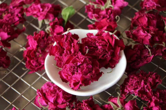 玫瑰花茶可以搭配枸杞、杭白菊等材料,取玫瑰花、枸杞、杭白菊、金盏花各5克,乌梅干5粒,将这些材料放入茶壶中倒入开水煮开饮用,能够起到调节内分泌、缓解疲劳等作用。
