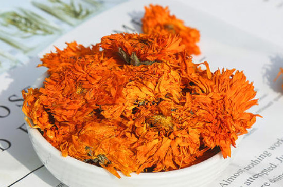 金盏花茶可以搭配甜菊叶、马鞭草等材料,取金盏花1匙、甜菊叶2片、马鞭草1匙,香蜂叶2~3片、陈皮3块,肉桂粉1匙一起煮饮,能够起到稳定心态、缓解神经等作用,在早上食用还有醒神之效。