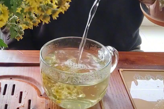 百合茶可以搭配菊花冲泡,先将玻璃杯用沸水烫洗干净,再将3g百合茶和2g菊花投入玻璃杯中,注入80~85℃的开水冲泡,3分钟后即可品饮。