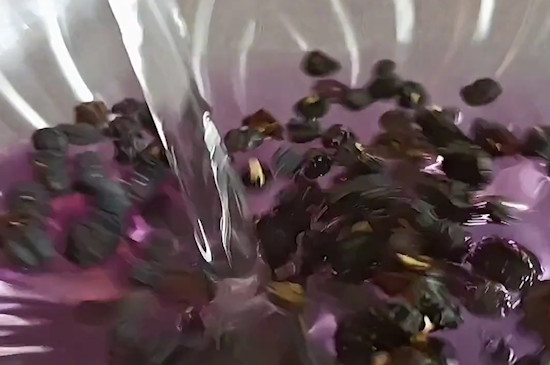 接着取出玻璃杯置于一旁,把15~20颗黑枸杞放入容器中,加入清水,把黑枸杞表面的灰尘杂质等尽数清洗干净,并投入玻璃杯中。