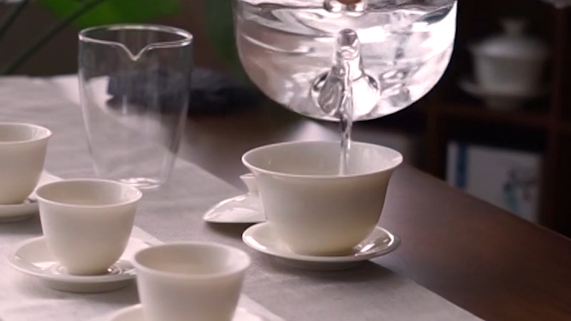 洁具是泡茶的首要步骤,先将白瓷盖碗投入茶洗中,揭开碗盖,倒入刚烧开的沸水,之后盖上碗盖,用沸水浇淋盖碗烫洗,需要注意的是盖碗必须热透。
