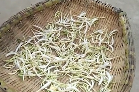 金银花开放时,采摘新鲜的花胚,最佳时期是当花蕾由绿变白且上部膨大的时候,此时金银花香气最浓,颜色嫩绿,然后将金银花放入清水中冲洗,并挑除老叶和其它杂物,以保证花胚的洁净。