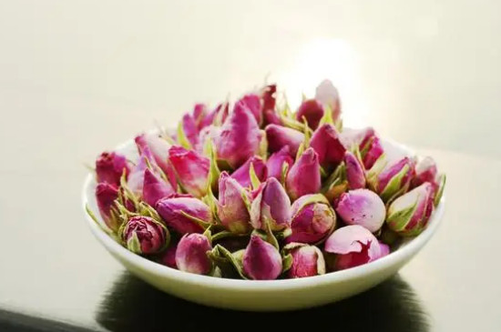 玫瑰花茶在制作时,首先将茶坯和新鲜的花苞分别装入不同的网格袋中,隔层放置2-3小时,取出后互相混合装袋,再放置2小时,取出后经过窨制处理,剔除碎叶之后便可制为成茶。