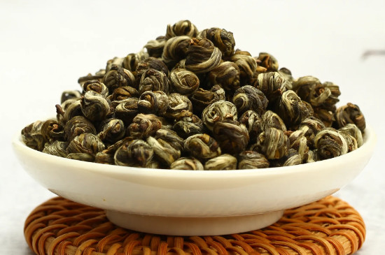 白龙珠属于花茶,是茉莉花茶中的一种,因为干茶表面混杂有洁白的茉莉花,远观为银白的球状颗粒,因此被称为白龙珠,是以绿茶茶坯和茉莉花苞为原料窨制、压制而成。