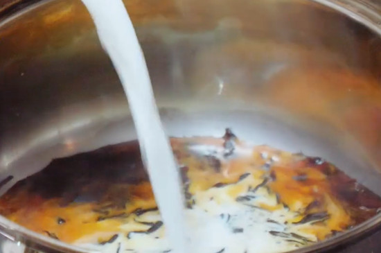 四季奶青在制作时,先将清水倒入奶锅中,开大火慢慢烧至沸腾,让清水不断有小气泡冒出,之后倒入茉莉花茶,盖上锅盖转小火煮5分钟左右,直到茉莉花茶完全吸水膨大。