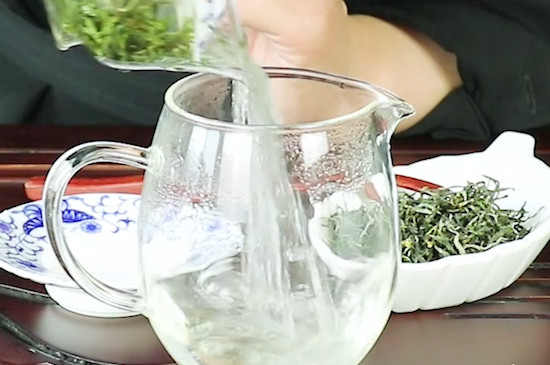 绿茶在洗过之后,继续往玻璃茶壶中注入开水,盖上壶盖,耐心等候1~2分钟后提起玻璃茶壶,把茶汤缓缓倒入玻璃茶杯中,倒7分满即可,细细品饮能品出绿茶的鲜爽滋味。