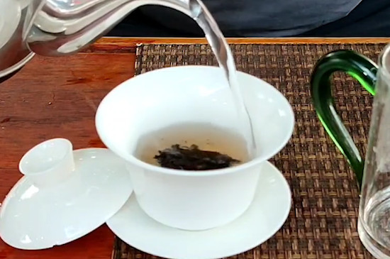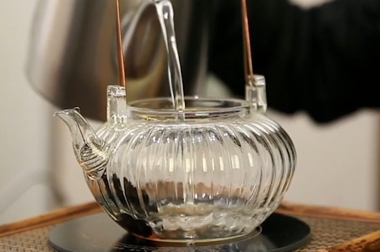 接下来取出紫砂壶和紫砂杯,拿起盛有普洱茶饼的白纸,用茶匙把普洱茶饼投入紫砂壶中,注入刚烧开的沸水,并用茶匙搅拌均匀,10秒后倒掉茶汤,依次往复3次。