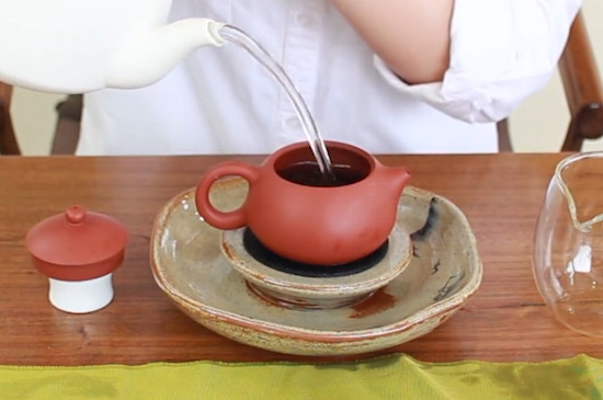 普洱生茶在冲泡时,先将紫砂壶放入茶洗中,揭开壶盖,注入刚烧开的沸水,盖上壶盖,用沸水浇淋紫砂壶。再用茶夹夹取紫砂杯,放入茶洗中,提起紫砂壶,倒出沸水烫洗紫砂杯。