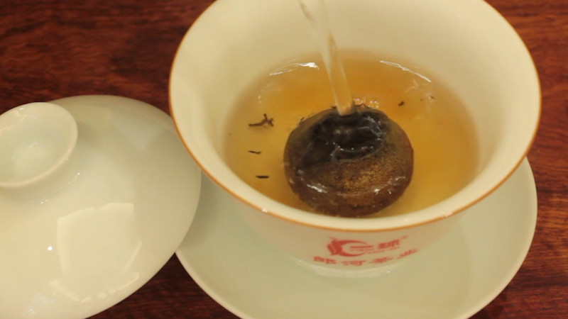 接着将4~5g的熟普洱茶投入盖碗中,注入沸水,并在5秒钟后将这第1泡茶汤倒掉,之后再用沸水泡第2道茶汤,盖上碗盖闷泡,5分钟后将碗盖掀开即可品饮。