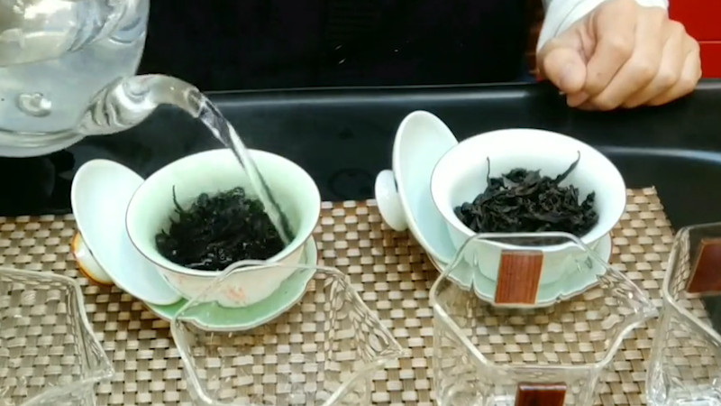 1、大红袍,条索紧结壮实稍扭曲,色泽油润带宝色;2、武夷水仙,茶形肥壮,色泽绿褐油润带宝色;3、武夷肉桂,条索匀整,紧结壮实;4、水金龟,条索肥壮,自然松散,色泽绿褐油润呈宝色;5、铁罗汉,条索紧结,色泽绿褐鲜润。