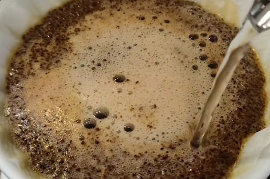 随后把锥形滤纸或滤网垫在咖啡杯上,倒入咖啡粉,提起咖啡壶,由内向外顺时针方向慢慢对咖啡粉打圈注水,尽量不碰到滤纸,让咖啡粉吸附在滤纸或滤网上,使咖啡得以均匀冲泡。