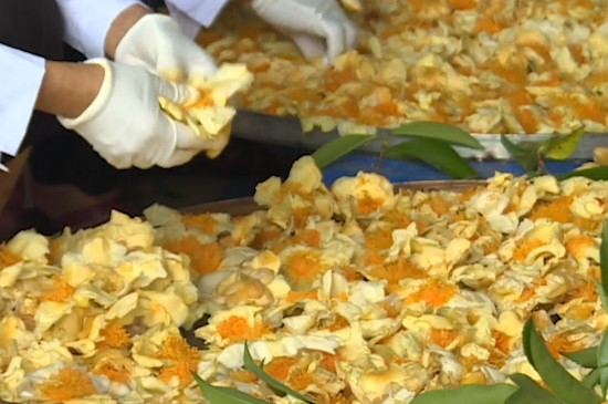 将金花茶制成茶,先将金花茶的花瓣摘下来用清水洗净,再摊放在竹匾上,置于阳光下晾干,随后再进行特定的杀青、解块、烘干等工序,造就了金花茶香气淡雅,芳香宜人的特点。