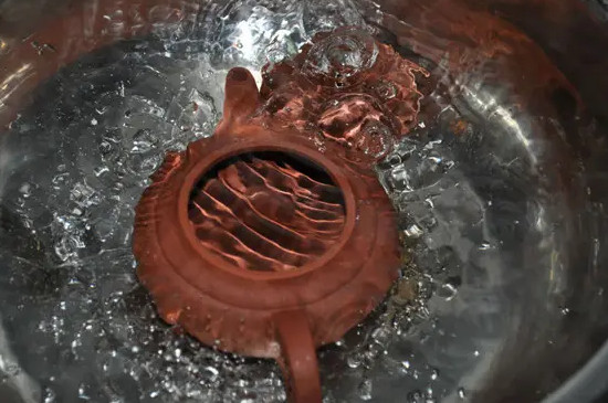 准备一口干净无油的锅,往锅中放入一块豆腐,然后把紫砂壶放入,小火烹煮5-10分钟,让茶壶吸水豆香。经过高温烹煮后,紫砂壶中的陈年茶垢会被豆腐吸附,从而脱落。