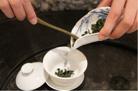 再将茶叶放置壶中之前,投茶量的多少根据人数决定,2-3人取7g左右,4人取10-12g左右,部分茶叶因为条索紧实,内质丰富,也可以使用中投法投茶冲泡。