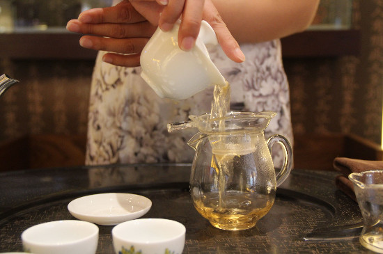 现将热水注入壶中,1/3容量即可,微微摇晃浸润之后,迅速将茶汤倒掉,头泡茶承担洗去杂质和苏醒茶叶的作用,为之后的冲泡时更快释放茶香做准备。