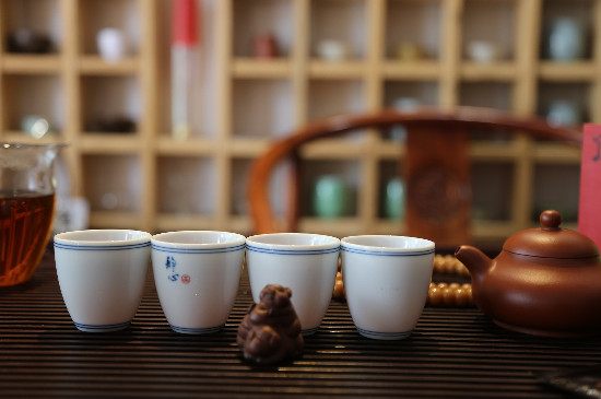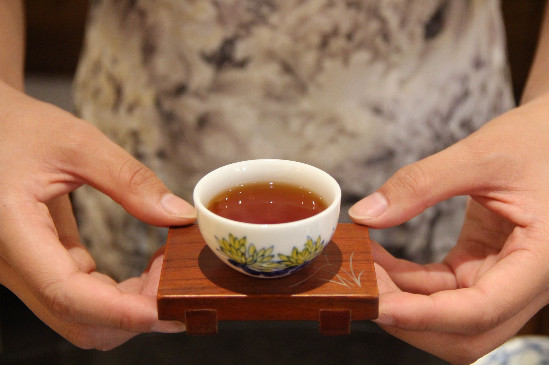 品茗时,使用右手持杯,拇指和食指夹住杯身,中指再拖住杯底,被称为“三龙护鼎”,更体现出茶在交流中的地位和身份,缓缓靠近嘴唇,轻抿品尝。