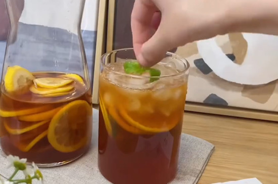 红茶泡好之后,即可将切片的柠檬放入玻璃茶壶中,浸润3-4分钟后,再加入白糖或者蜂蜜,然后用勺子轻轻搅动,使糖充分融化,再次浸泡2分钟后即可品饮,若是喜欢冰镇的口感,可以放入冰块。