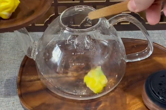 玻璃杯温洗后,趁杯内还有余热,往杯中投入2-3朵金花茶,接着倒入少量的热水,微微浸润金花茶,然后把水倒掉,提起水壶,沿着杯壁高冲沸水,水量以不溢出茶杯为宜,浸泡3-5分钟后出汤。