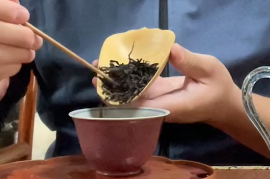 通常一个容量在120毫升的盖碗,需投茶8克,根据该比例,适当放入肉桂干茶。投茶后,可以闻闻肉桂茶的香气,茶叶在茶杯的余温下,其中的芳香物质开始涌动,从而释放香气,带有一股焦糖香。