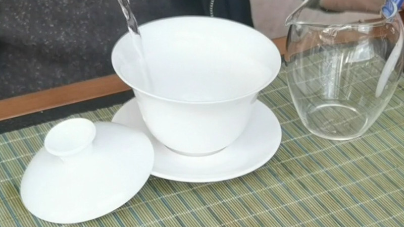 1、备器温具,准备烧水壶、白瓷盖碗、公道杯、品茗杯,将热水倒入盖碗中烫洗,倒入公道杯、品茗杯中冲洗;2、取茶入碗,容量为170毫升的盖碗,投茶量在8-9克之间;3、注水冲泡,先沿着碗壁环绕注水,水量到达盖碗的二分之一时改为定点直冲。