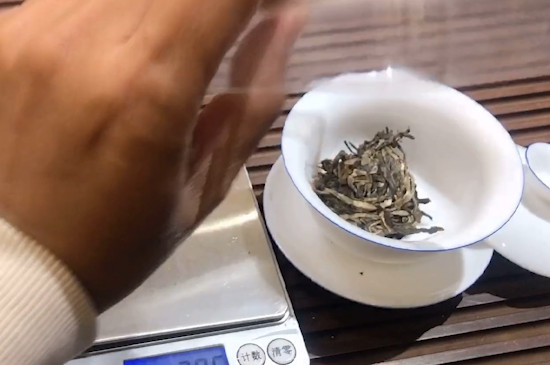 茶具温洗以后,拿出茶叶罐,用茶夹取适量茶叶放在电子秤上,通常容量在170毫升左右的盖碗,投茶量在8-9克之间,然后将称重后的小户赛古树普洱茶投入盖碗中,若是喜欢喝浓茶,可放入9.5克干茶。