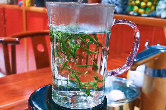 1、温杯,往玻璃杯中倒入热水进行冲洗,保证茶具的洁净;2、润茶,先在杯中投放5克雀舌干茶,之后倒入少量热水洗茶,使茶叶吸收充足的水分;3、冲泡,采用凤凰三点头的方式往杯中冲入热水,让雀舌茶在水流的带动下充分翻腾,等待1-2分钟后出汤品饮。