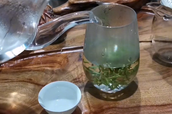 冲泡雀舌茶时,建议采用凤凰三点头的方式注水。经过三次高冲,使茶叶在杯中尽情的翻腾,冲水量为杯容量的七成左右,等待1-2分钟即可品饮。用高冲的方式冲泡雀舌茶,有利于激发出茶香和茶味。