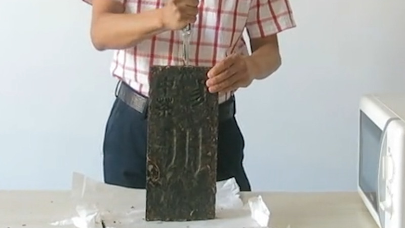 砖茶属于紧压茶,在冲泡时,需先将茶刀从砖茶的一侧插入,接着沿着边缘缓缓撬开,顺着茶叶的纹路将砖茶一层层的剥落开,注意保证茶型的完整,之后将撬下来的部分砖茶放入紫砂罐中存放。